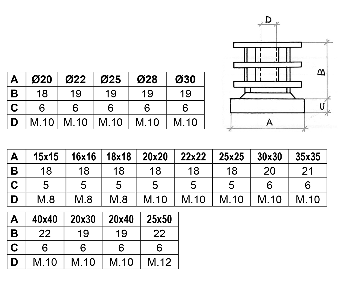 | Misure | mm. 15×15, mm. 16×16, mm. 18×18, mm. 20×20, mm. 22×22, mm. 25×25, mm. 30×30, mm. 35×35, mm. 40×40, mm. 20×30, mm. 20×40, mm. 25×50, Ø mm. 20, Ø mm. 22, Ø mm. 25, Ø mm. 28, Ø mm. 30 |