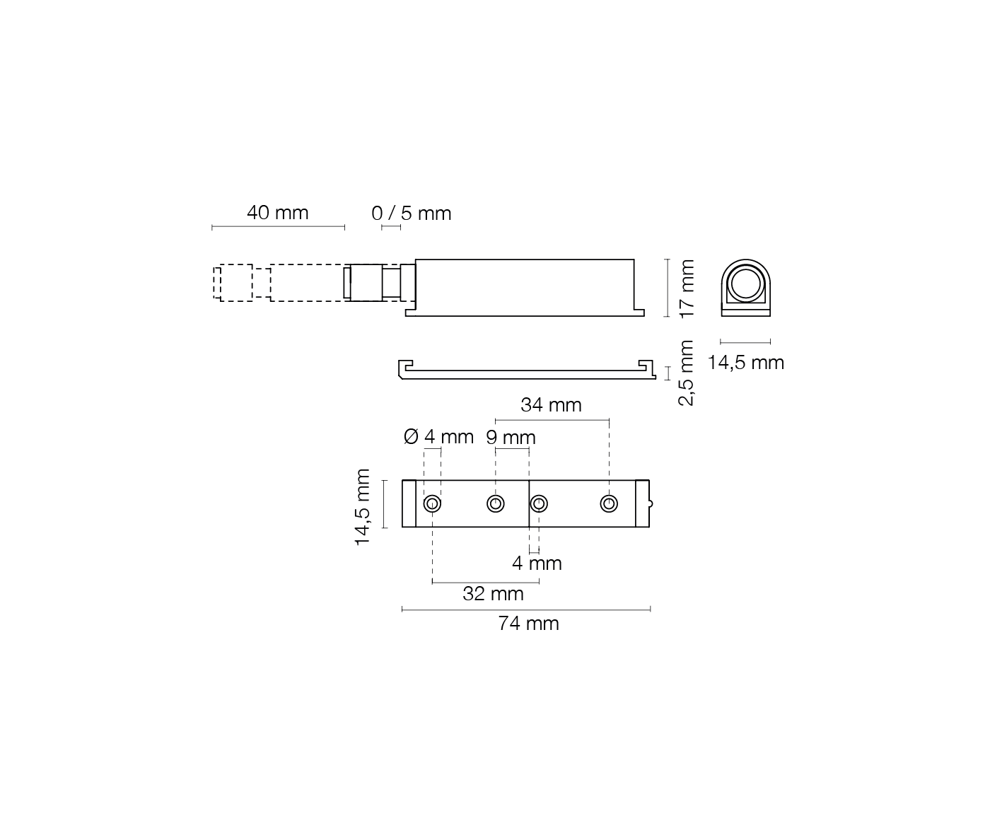 Corsa mm.  40 con paracolpo, fissaggio con basetta con fori.