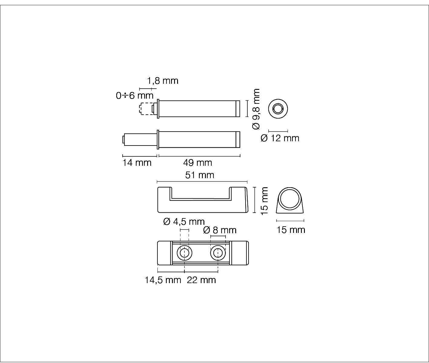 Corsa mm. 14 con magnete neodimio, fissaggio con basetta con fori.